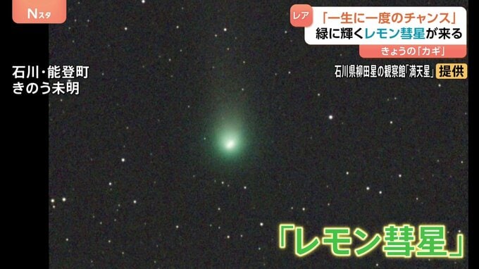 満点の星の中、一際緑色に輝く星。その名も「レモン彗星」です。鳥取県で撮影されたレモン彗星は、右の方向に淡く尾っぽが伸びています。石川県柳田星の観察館「満点星」 宇佐美拓也学芸員「今回のレモン彗星は今…