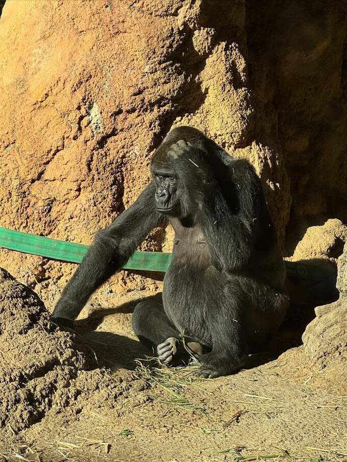 2枚目の写真には、赤茶色の岩場と砂地の上に座るゴリラの姿が捉えられています。黒い体毛を持つゴリラは、片手を頭に当てているポーズで、まるで何かを考えているかのような印象的な姿です。