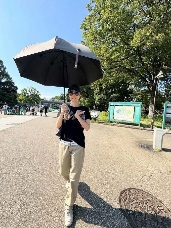 投稿には2枚の写真が添えられています。1枚目は高岡さん自身の姿で、黒いキャップとサングラス、Tシャツにベージュのパンツ、白いスニーカーというカジュアルなスタイル。日傘をさしながら、カメラに向かって微笑んでいる様子が写っています。