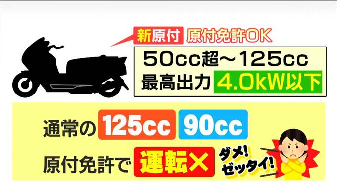 新基準原付は、125cc以下で最高出力を4.0kW以下に抑えた二輪車です。「4.0kW以下」というのがポイントで現在の原付免許で運転することができます。一方、今も流通している通常の125ccや90ccの原付二種のバイクは原付免許では運転できませんので十分注意が必要です。