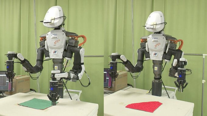 奈良先端科学技術大学院大学で研究されているのは、自分で練習して技術を覚えるAIロボット。「ハンカチを緑から赤の面へ裏返す」という課題を与えます。最初は手探りですが、赤色の面積が広がってくると、ロボットは自分自身を褒めます。自らを鼓舞して、さらに試行錯誤を繰り返し、コツをどんどん掴んでいきます。約4時間で自分で練習した技術をものにしました。