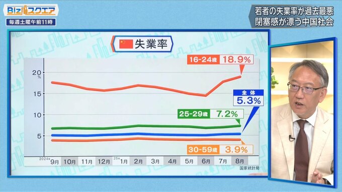 「清華大学の研究チームの調査では、“実際は30%を超えている”と言われているらしい。また、先ほどの深圳で職探しをしているような出稼ぎの人を入れると50%を超える。このまま若者が就職できないとなると、自暴自棄になって社会に対する報復、犯罪に走る可能性が出てくるので、ものすごく治安が悪化して社会不安になる」