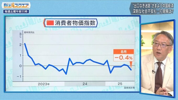 「中国は本来、14億の人口だから物価がマイナスになりにくい体質を持っている。それでも最近見ているとマイナス。あと卸売物価、生産者物価指数(PPI)はずっとマイナスが続いている。つまり企業が設備投資をしない、そうすると工業製品が売れない。消費者物価というのは、日用品、食料品などが入ってるので、“完全にデフレ状態に陥っている”」