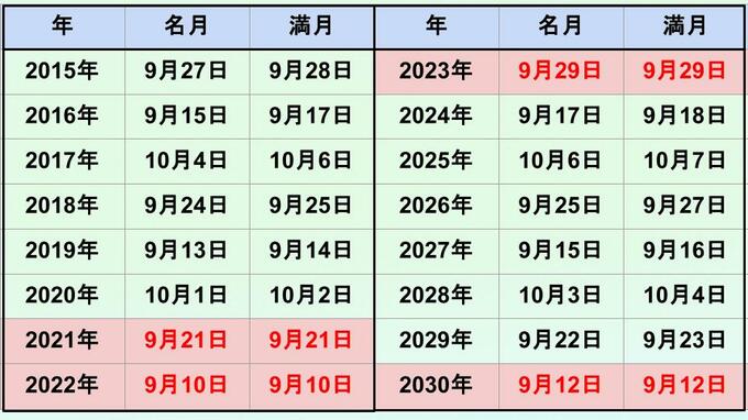 「中秋の名月」は旧暦8月15日の夜に見える月ですが、月の満ち欠けの周期(約29.5日)の関係で必ずしも満月になるとは限りません。