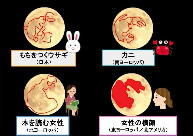 月には明るいところと暗いところがあり、その暗い部分が昔から日本ではウサギに見えるといわれています。ところが海外では違うものに見立てられていて、「カニ」や「本を読む女性」、「女性の横顔」などいろいろなものに例えられています。