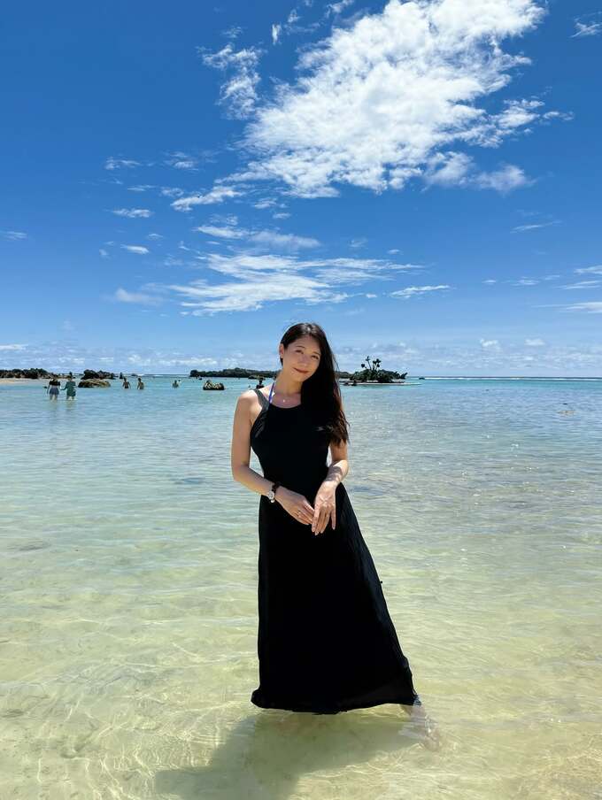 青空の下、白い砂浜の透き通るような海に、黒のノースリーブのワンピース姿でたたずむ穂川さん。