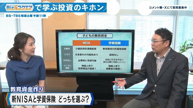 「大きな違いとしては、元本割れの可能性があるかないか。もう一つは、利回り。NISAは株とか投資信託であれば、基本的にはインフレにも負けないぐらいの利回りが長期では期待できるということ。一方学資保険は、100万円の契約したら18年後でも受け取るのは基本100万円なので、受け取る時までにインフレになっちゃうと、その100万円の価値は目減りする。リスクが大きいか小さいか、リターンが大きいか小さいか」