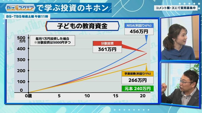 「NISAの利回り6%。S&P500の場合、過去40年弱の実績値は年率12%で、全世界株式、オルカンでも年率9%ぐらい。ただ、教育資金なので大風呂敷を広げるのも良くないから6%と低めに想定した。分散投資は3.5%で、多分インフレにも負けず、ちょっと実質的に資産を増やせるかなと、そんな感じだと思う」