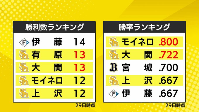 まずは「勝率第1位」のタイトル争い。現在、勝率トップは勝率.800のモイネロ投手。大関投手が.722で2位だが…。このタイトルの条件は「13勝以上の投手」が対象だ。このまま終われば12勝のモイネロ投手ではなく、大関投手がタイトル獲得となる。