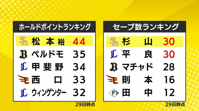 また「セーブ王争い」が白熱の展開となっている。今シーズン、オスナ投手が抜けた穴を埋めた新守護神の杉山投手が30セーブをあげて単独トップに立っていたが…29日、西武の平良投手も30セーブに到達。ソフトバンクが残り3試合、西武が残り4試合と最後まで目が離せない。