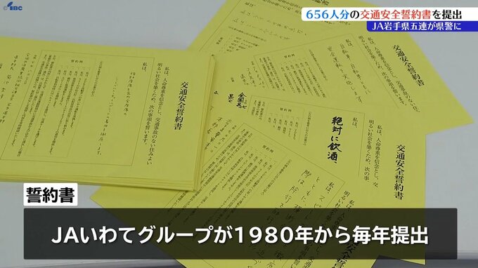 JA県五連と関係団体の役職員、合わせて656人分の誓約書には、「飲酒運転をしない」「ライトを早めに点灯する」など、一人一人の誓いが書かれています。