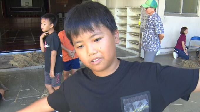 講師として地域で米作りをしている大濵永太郎さんが指導にあたり、子どもたちは大濵さんの水田で収穫された稲わらで昔ながらの道具を使ってゴザを編み、2時間ほどかけてゴザを作りました。