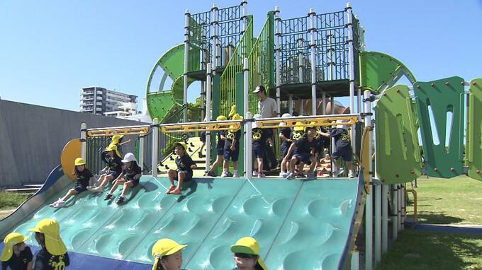 那覇市の新都心公園で9月30日、新たな大型複合遊具がお披露目され、市内の保育園の子どもたちが一番乗りで遊具を楽しみました。