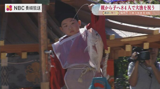 始まりは恵美須さま。活きのいい鯛を釣りあげます。大漁を祝う2隻の子舟と、親船の恵美須船。3隻の親子船が海の漁を繰り広げます。