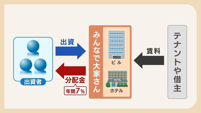 ビルやホテルといった物件に出資をすると、テナントなどが支払う賃料収入から、年間で出資額の7%を分配されるというものでした。