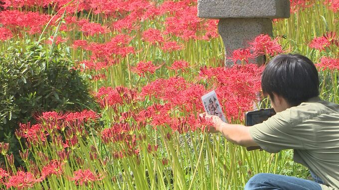 群生して咲く花の赤は目には秋の風情を感じさせますが、時折、セミの鳴き声も聞こえる中山頭火の詠んだ季節とはどこか、いつもとは違う風情も感じられます。訪れた人たちはカメラやスマートフォンを向けては秋の日のひとこまを切り取っていました。