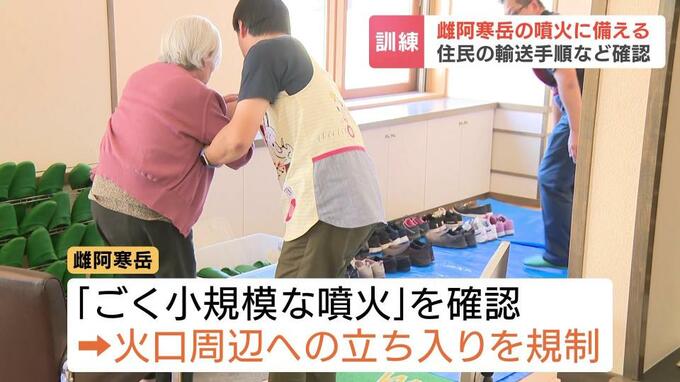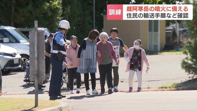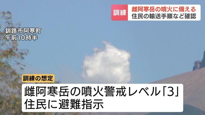 釧路市阿寒町での訓練は、雌阿寒岳の噴火警戒レベルが入山規制の「3」に引き上げられた上、土砂災害の恐れから住民に避難指示が出たとの想定で行われました。