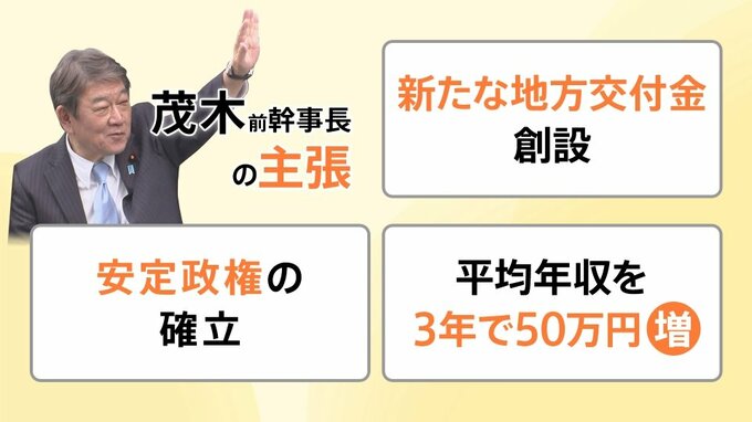 茂木前幹事長が掲げている主張は、▼安定政権の確立、▼新たな地方交付金の創設、▼平均年収を3年で50万円増やすといった大きく分けて3つです。