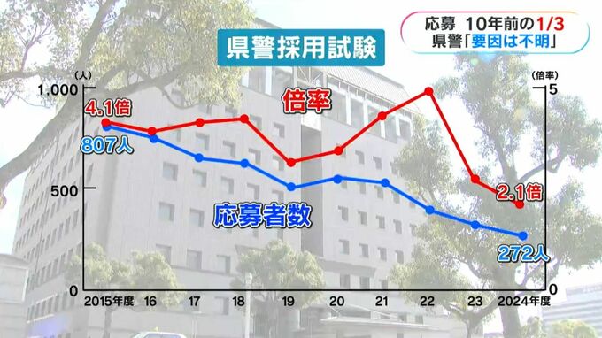 県警の採用試験の応募者数は2015年度にはおよそ800人でしたが昨年度は300人を割り、ここ10年でおよそ3分の1に減少しています。4倍以上あった倍率も昨年度はおよそ半分に落ち込んでいます。