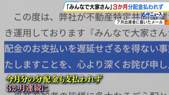 「みんなで大家さん」。3か月連続で分配金が支払われていないことがわかりました。 大阪の不動産会社「都市綜研インベストファンド」は、賃貸物件に出資した人に年利7%の賃料収入を分配する投資商品「みんなで…