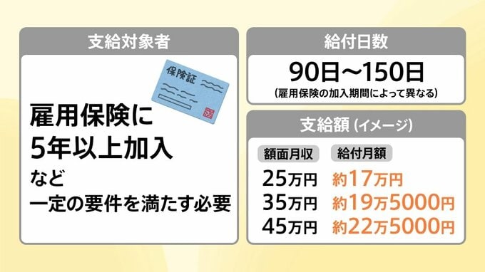 支給対象者は、雇用保険に5年以上加入するなど一定の要件を満たす必要があります。給付日数は90日~150日で、雇用保険の加入期間によって異なります。