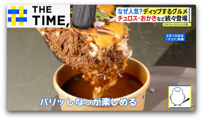 さらに、▼タコスブーム(8/7放送)では、『BLUE ENTRANCE KITCHEN』(東京・中目黒)の、ほぐし肉のタコスを【スープにディップする】メニューが登場。