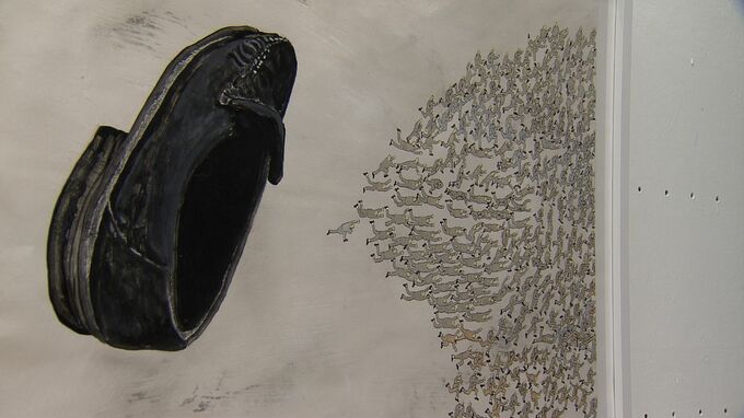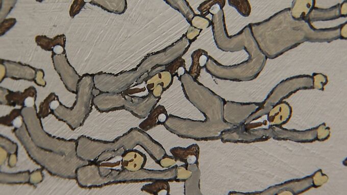 「靴がくさすぎて、おじさんたちが逃げている絵です。障害があっても絵を1日1日が書いていると楽しい」