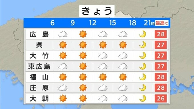 きょう1日(水)の広島県内の朝は、この時期らしいひんやりとした空気になっています。最低気温は、広島市中区19.3℃、呉19.0℃、三次16.2℃でした。