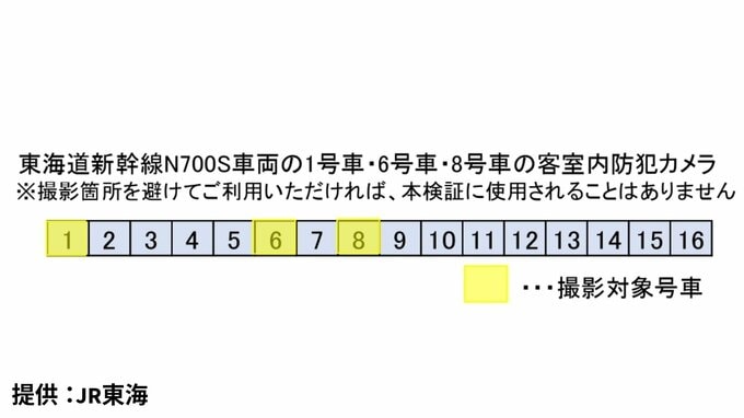 撮影されるのは、東海道新幹線N700S車両の「1号車(自由席)」「6号車(指定席)【画像②】」「8号車(グリーン車)」の客室内防犯カメラ(1車両につき6台)となっていて、撮影車両を避けて利用すれば、今回の検証に使用されることはないということです【画像③】。検証に使用する映像データは全ての運行車両ではなくランダムに抽出するとしています。