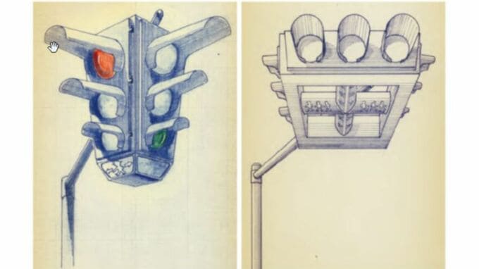 名古屋電機工業の社史によると、ヨーロッパで見た「ワイヤーで吊り下げる信号機」をヒントに、1本の柱で信号機をつり下げるデザインを考案したといいます。そして、歩行者用と車両用の信号をひとまとめにし、4つの面に信号灯を配置した信号機が完成しました。