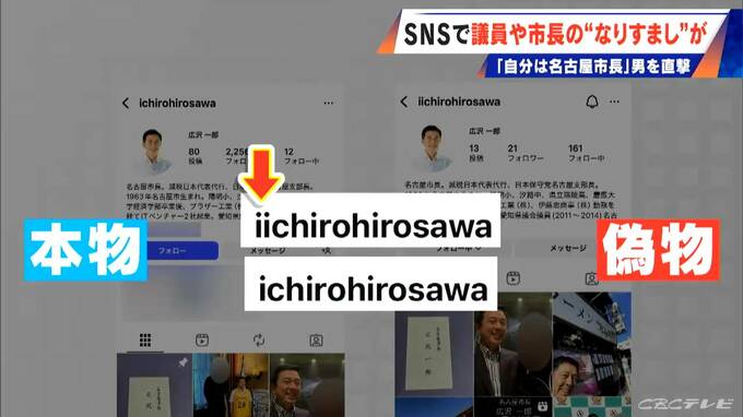 広沢一郎名古屋市長を騙るこのアカウント。本物と見比べると「iichirohirosawa」と、頭の「i」が一つ多いですが、投稿している画像や文章はほぼ同じ。