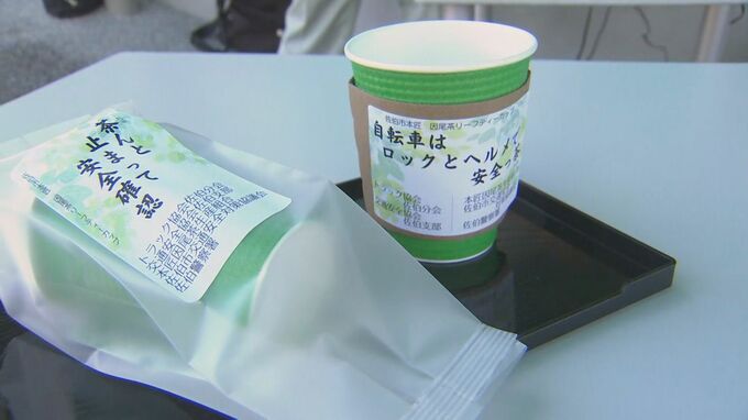 地元特産のお茶を使って交通安全を呼びかけようと、大分県佐伯市の道の駅で茶葉入りの紙コップがドライバーに配られました。