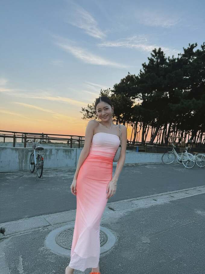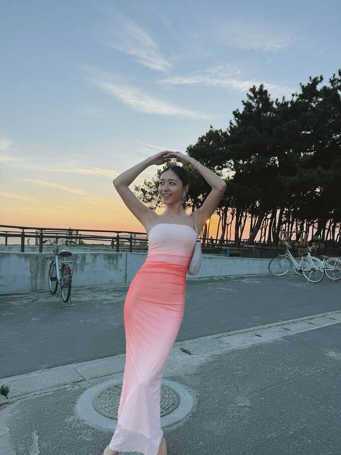 披露された写真では、池田さんが夕暮れをバックに立つ姿や、ノースリーブのグラデーションドレスを着た全身ショットが見られます。ドレスは上部が淡い色で下に向かってオレンジ色が濃くなるデザインで、肩を露出したスタイリッシュな装いです。