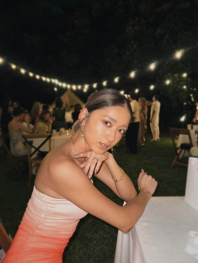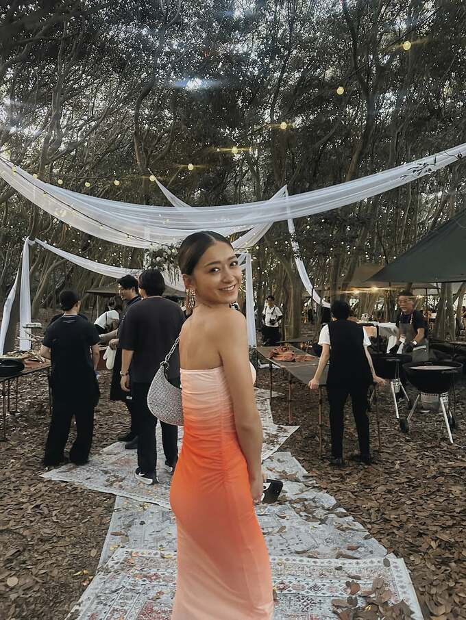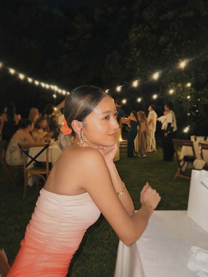 また、木立に囲まれた屋外のパーティー会場での様子も公開されています。会場は白い布が天井のように垂れ下がり、地面には絨毯が敷かれ、自然の中でのカジュアルな雰囲気を演出していました。夜のシーンでは、ストリングライトのあたたかな光に包まれた会場で、池田さんがテーブルに肘をつき微笑む姿も。