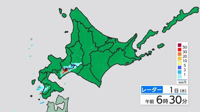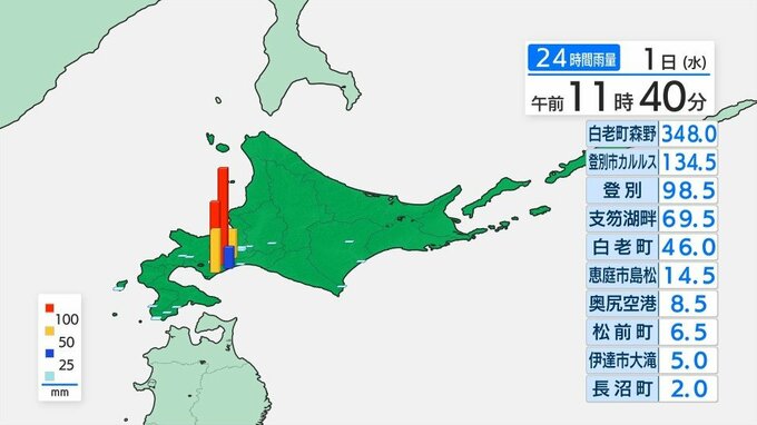 1日朝、白老町森野で、午前6時21分までの1時間に123.5ミリの猛烈な雨を観測し、1時間に降った雨の量としては統計史上最多となりました。