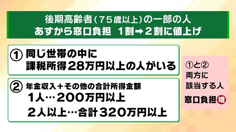 値上げされるのは、食料品だけではありません。10月1日から、一部の75歳以上の後期高齢者の医療費負担が増えます。“経済的に余裕がある人”が対象で、具体的には、以下の条件(1)(2)の両方に該当する人の窓口負担が「1割→2割」となるのです。