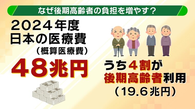 なぜ後期高齢者の負担を増やすのか? その背景には「医療費増大」という課題があります。2024年度の日本の医療費(概算医療費)は48兆円にまで膨らんでいて、そのうち4割(19.6兆円)が後期高齢者に費やされているのです。