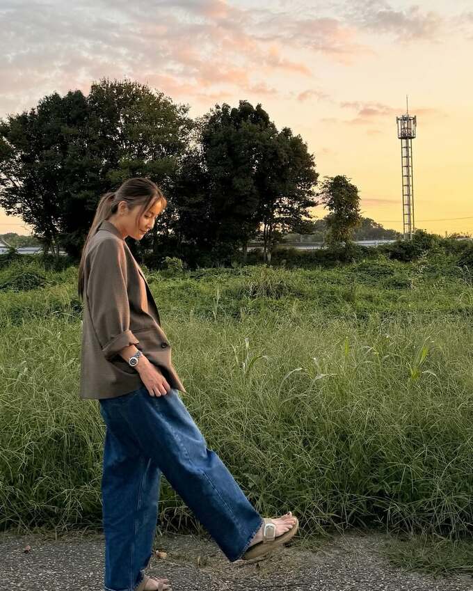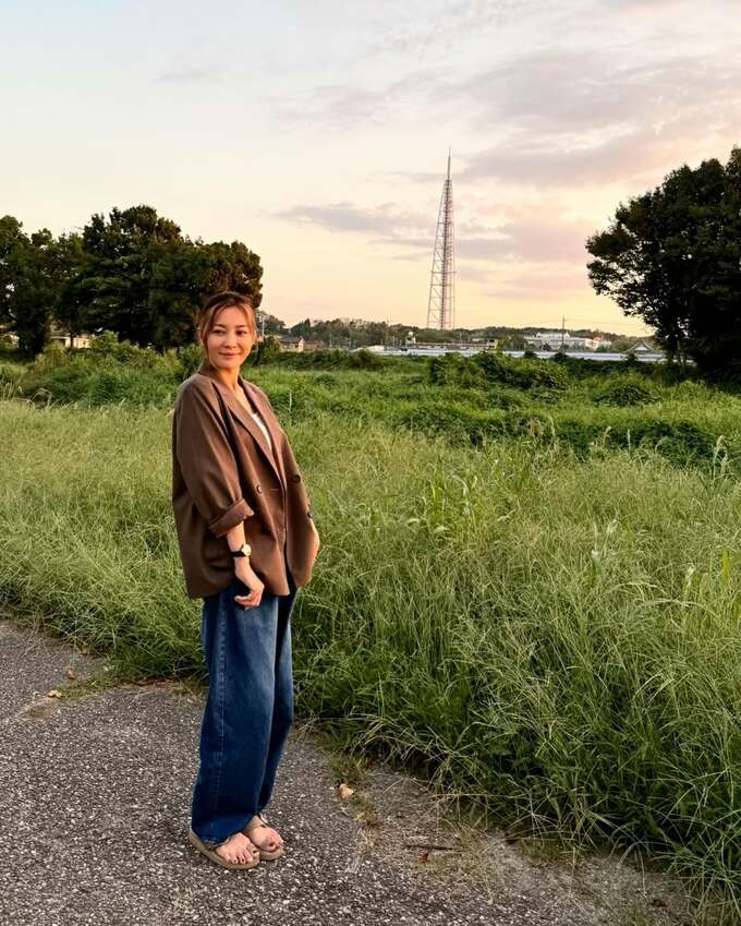 投稿には夕暮れ時の公園や草原で撮影された瀬戸さんの姿が複数枚添えられています。茶色のチェック柄ジャケットに白いトップス、デニムパンツを着用し、穏やかな表情で佇む姿が印象的です。オレンジ色に染まる夕日を背景に、懐かしい風景の中で過ごす様子が切り取られています。