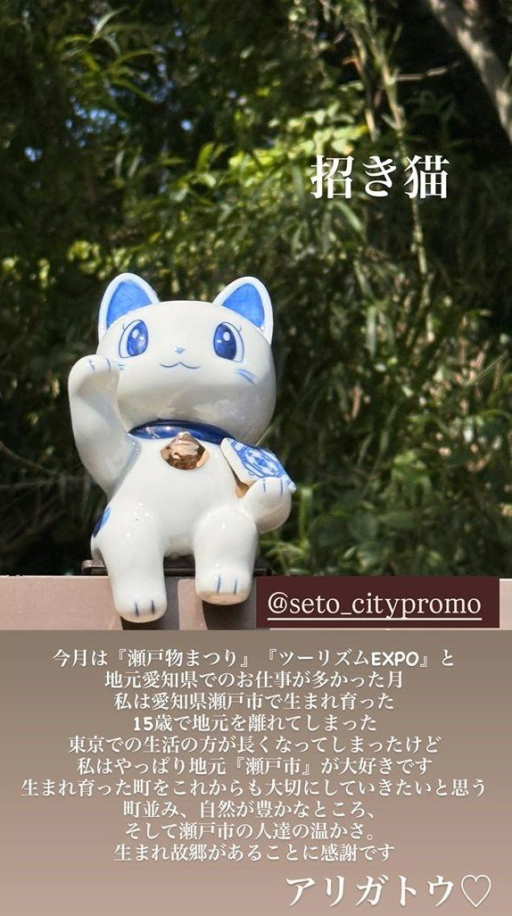 瀬戸さんは「町並み、自然が豊かなところ、そして瀬戸市の人達の温かさ」と故郷の魅力について語っています。瀬戸物で知られる瀬戸市にちなみ、投稿には青い耳と瞳を持つ白い招き猫の写真も掲載されました。