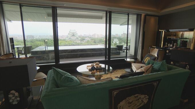名古屋城の屋根の色をイメージしたソファーや広々としたリビングも。外にはプール。目の前には名古屋城です。贅を尽くした「鳳凰スイート」の宿泊料金は、なんとサービス料込みで1泊約300万円。