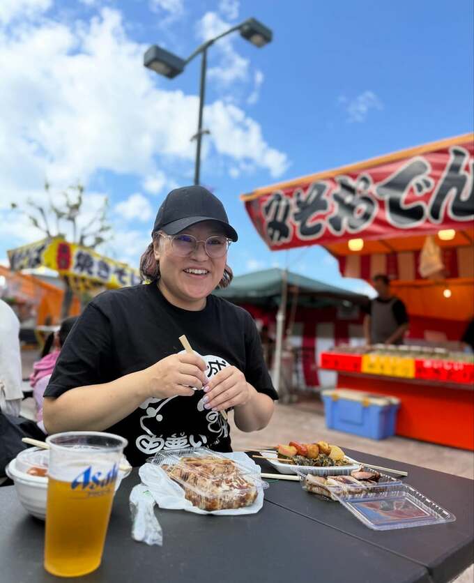 そんなバービーさんは「10代のあの頃に一瞬で戻れる地元があるって幸せだなぁ」とテキストしつつ、屋台のテーブルで、たこ焼きやおでんなどの屋台料理にビールという “幸せ” に囲まれた笑顔の写真を投稿。