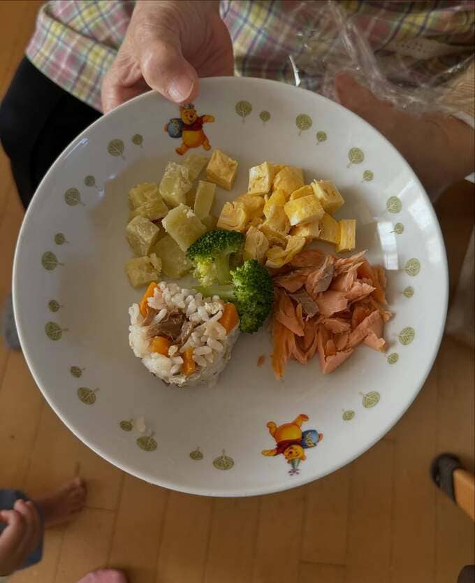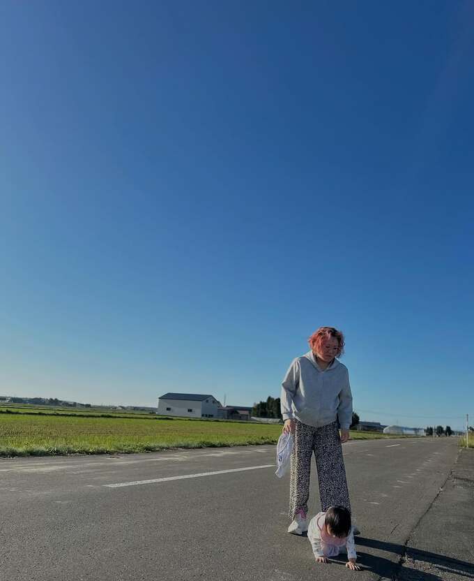 さらに「実家では母・順子が娘にごはん作ってまっててくれてカンゲキ!」と、卵焼き・ふかし芋・ブロッコリー・混ぜご飯・焼き鮭のほぐしが盛られたお皿の写真を投稿。地元の広大な原っぱの前の道で自由に「はいはい」する娘を後ろから見守ってついていく自身の写真も投稿しています。