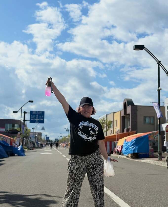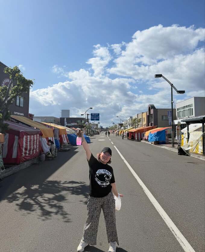 バービーさんは「約20年ぶりに地元栗山町の秋まつりにいってきたよん」とテキスト。真っ直ぐに伸びる町の大通りとその向こうに広がる青空を背に、飲み物を持って右手を突き上げるバービーさんは爽快な笑顔。「まさか子供と夫と来る日がくるなんて...」と感慨を綴っています。