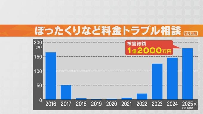 愛知県警には今年に入り、ぼったくりなど料金トラブルに関する相談が180件と、過去10年で最多になり、被害総額は1億2000万円にのぼっています。警察は取り締まりを強化するとともに、ぼったくり被害の多くは客引きがきっかけだとして、安易について行かないよう注意を呼びかけています。