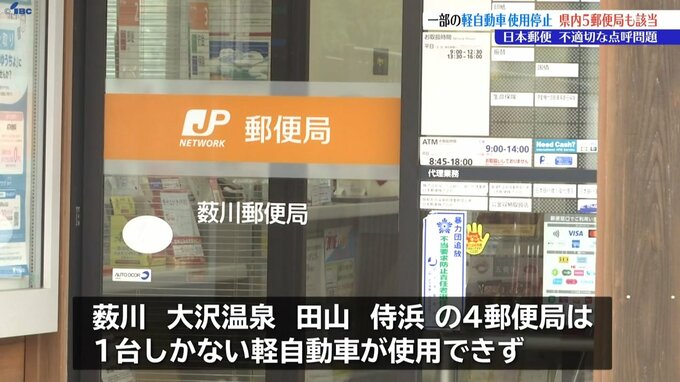 処分の期間は最大で159日間となっていて、このうち薮川、大沢温泉、田山、侍浜の4つの郵便局では配置されている1台しかない軽自動車が使用できないことになります。