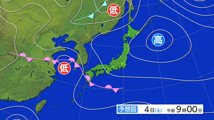 一方、4日(土)の午前9時では、低気圧が黄海にあり、そこからのびる前線が九州付近にかかりそうです。