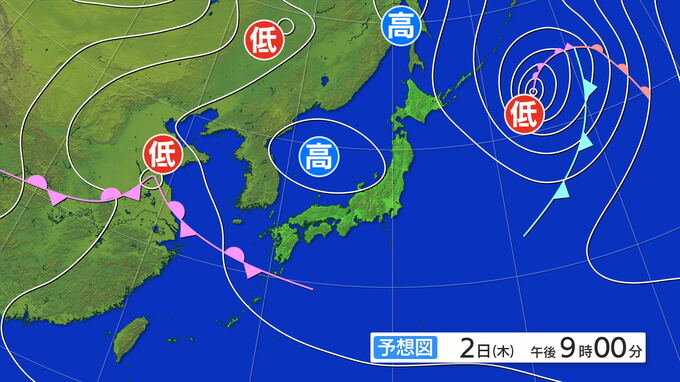 2日午後9時の予想天気図です。日本列島付近は移動性の高気圧に覆われるでしょう。晴れるところが多いですが、気温は高くなりそうです。