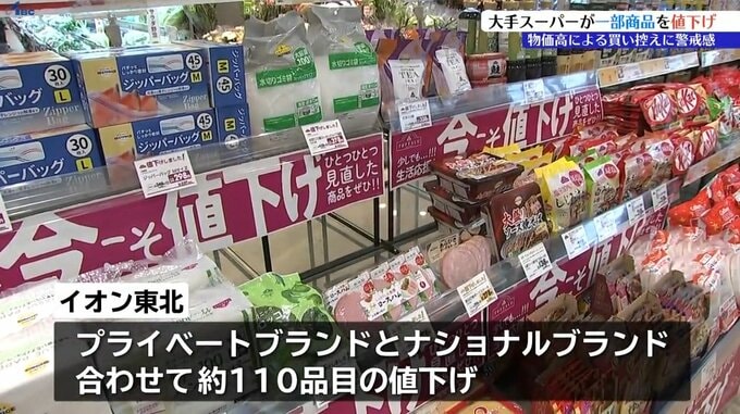 イオン東北では、1日からプライベートブランド60品目と、ナショナルブランドと呼ばれるメーカーが製造した商品およそ50品目を合わせたおよそ110品目を値下げしました。