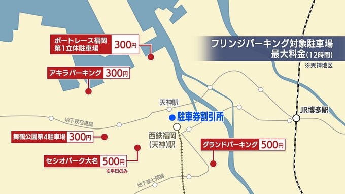 福岡市で、天神周辺にある3か所の駐車場料金が「半日止めても最大300円」となる社会実験が始まりました。