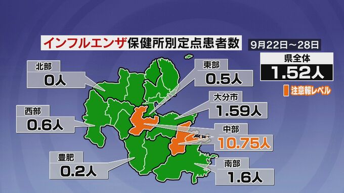 保健所別では中部が10.75人で注意報基準の10人を超え、南部が1.6人、大分市が1.59人など感染状況にばらつきがみられます。